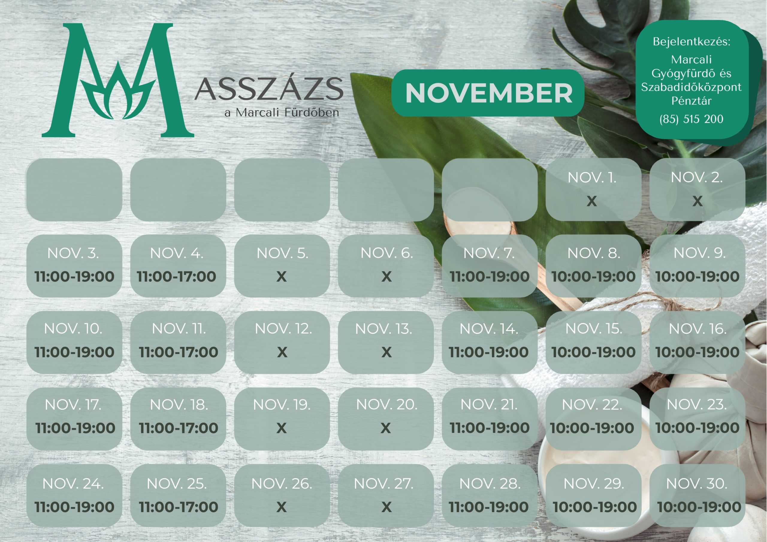 November hónapban az alábbi napokon érhető el masszázs a gyógyfürdőnkben: