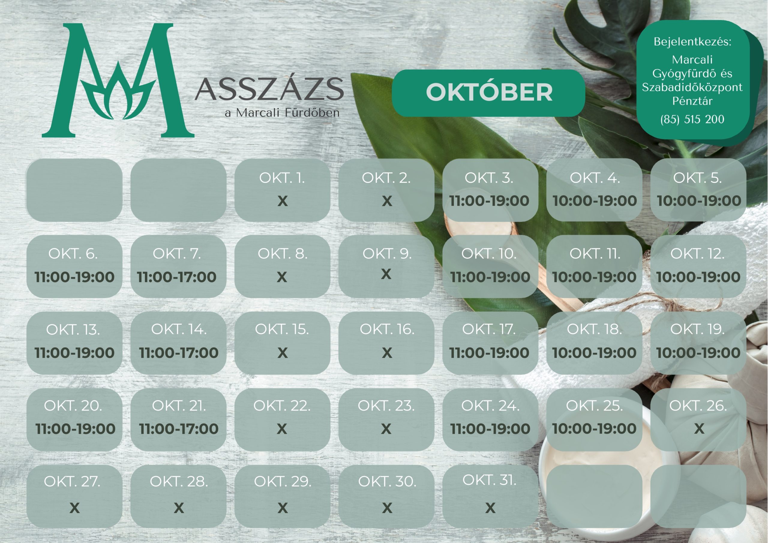 Október hónapban az alábbi napokon érhető el masszázs a gyógyfürdőnkben: