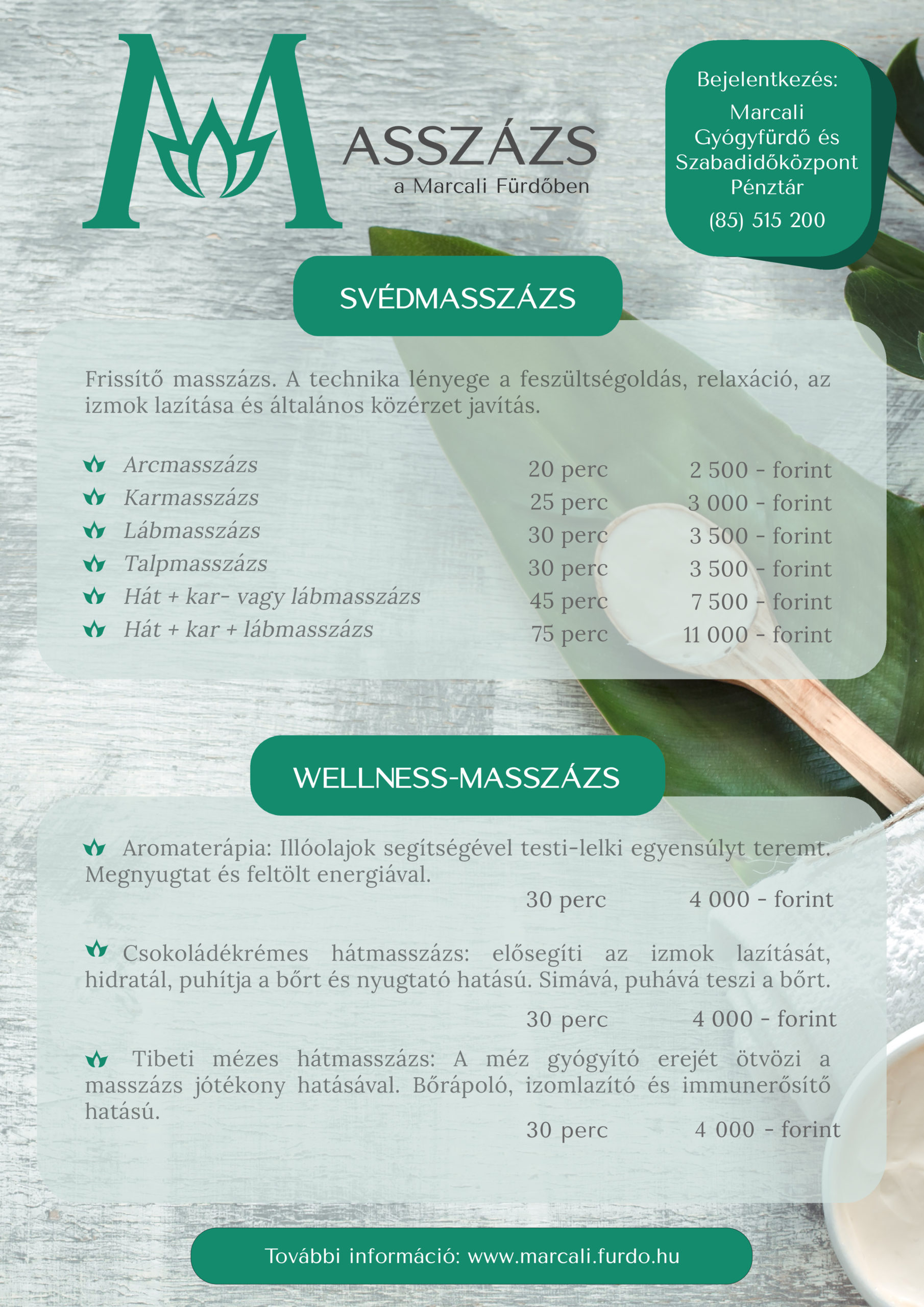 A wellness masszázsok igazi kényeztetést kínálnak azoknak, akik a pihenés mellett az érzékek felébresztésére is vágynak. A Marcali Városi Gyógyfürdő és Szabadidőközpontban olyan különleges masszázsok várják a látogatókat, mint az aromaterápiás, csokoládékrémes és tibeti mézes masszázs, melyek mindegyike egyedülálló élményt kínál.
