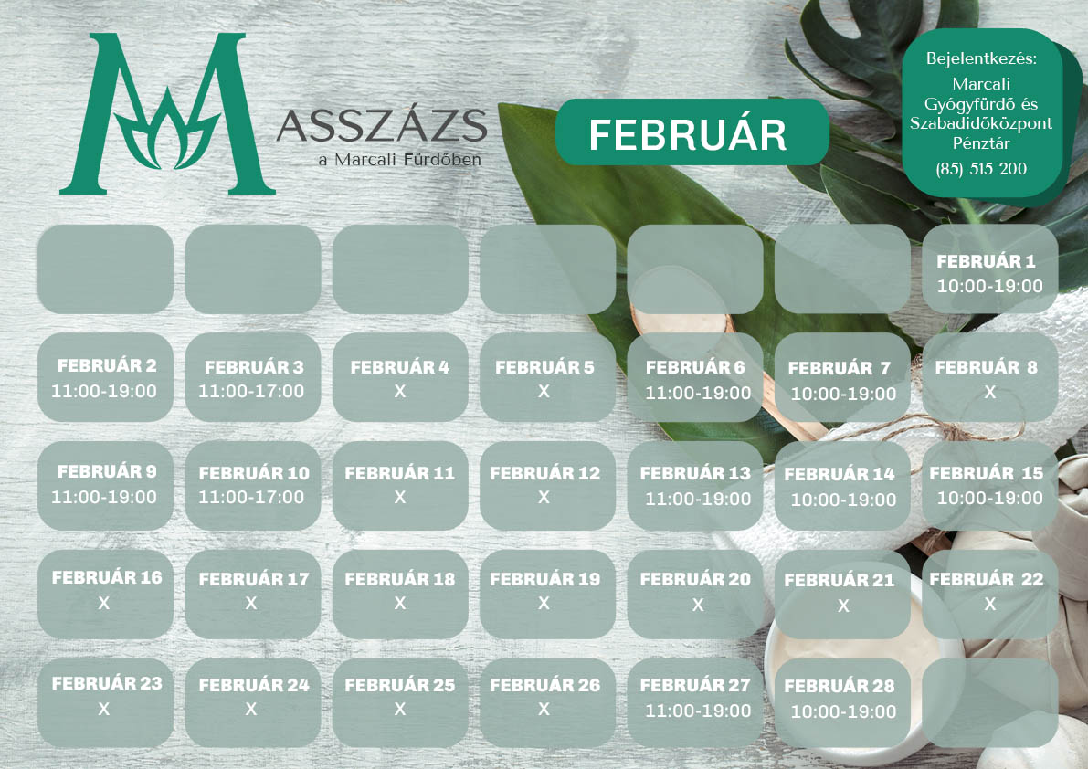 Február-március hónapban az alábbi napokon érhető el masszázs a gyógyfürdőnkben: